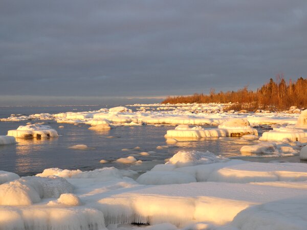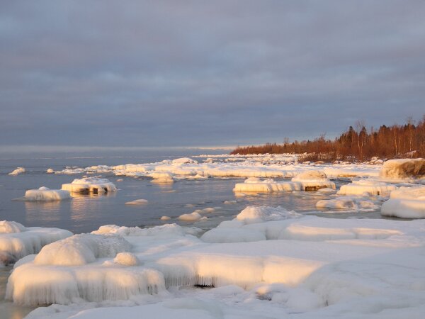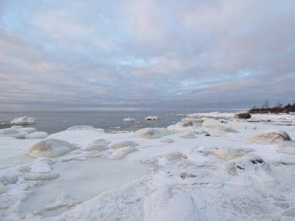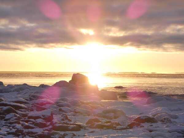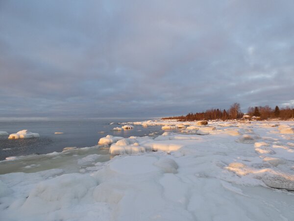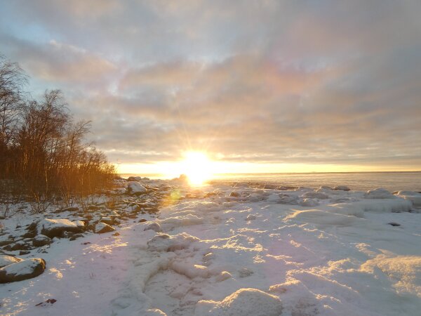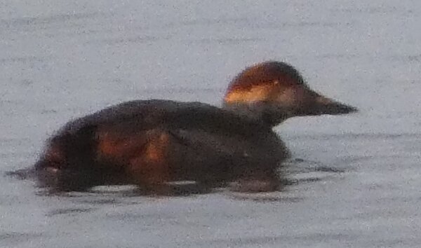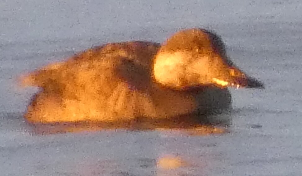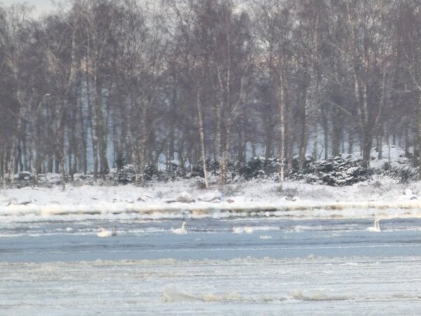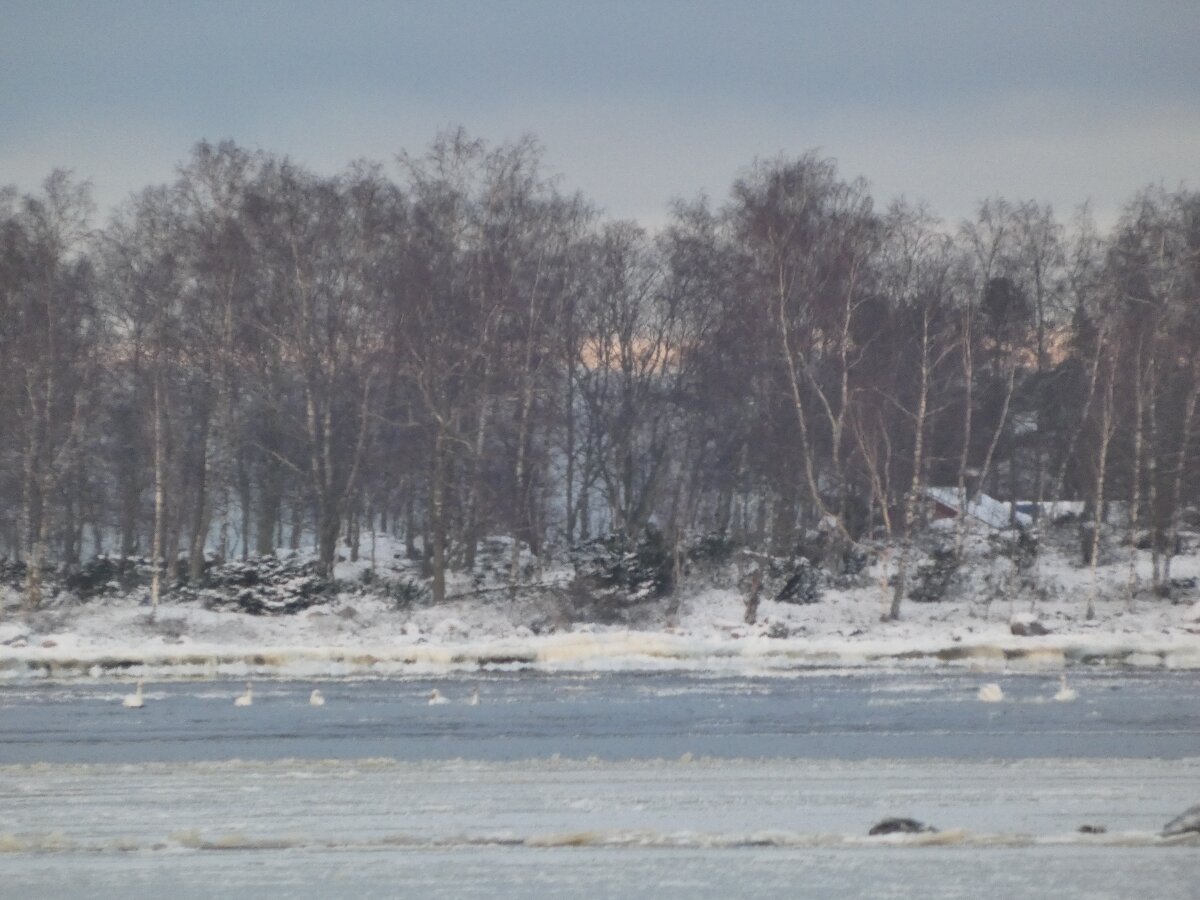 Löytyi vielä hieno hyvin laaja sulapaikka. Eilen tarkistin jääkartan ja siitä katsoen näytti että olisi tullut sula jopa sinne, missä aiemmin oli paljon joutsenia. Kävin tarkistamassa: jää oli ehkä kilometrin tai kahden päässä, saarten takana. Päätin mennä katsomaan sanotaan eteläisen ison niemen kärkeen. Siellä oli laajasti sulaa. Ja jopa laulujoutsenia. Neljä tai kolme paria sekä yhdellä parilla poikanen. Jälleen sai huomata, että talvi ei laulujoutsenia huoleta. Siellä ne heiluttivat iloisesti siipiään. Näytti, että niemen toisella puolella olisi paljon sulaa. Kun tulin rantaan, niin siinä aivan edessä oli tuo valkoposkiveslintu. Kauempana kalasteli saukko jälleen. Valkoposki vesilintu oli aika kesy ja tuli välillä lähemmäksi. Oli aika ihmeellinen tunnelma, kun sai aika pitkän pakkasjakson jälkeen seisoa sellaisen sulan rannalla ja aurinko paistoi.![]()