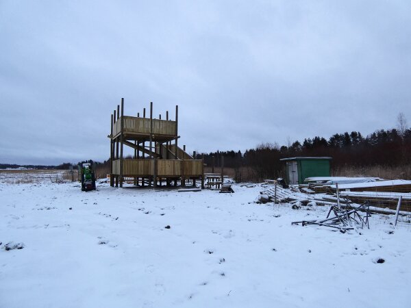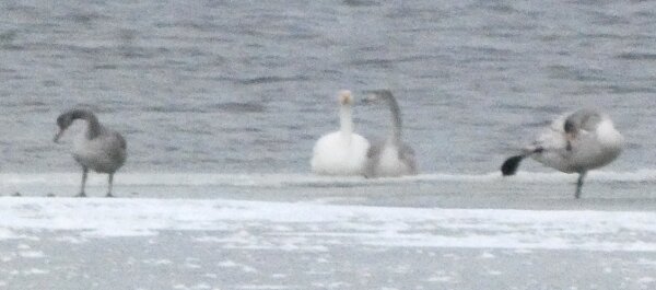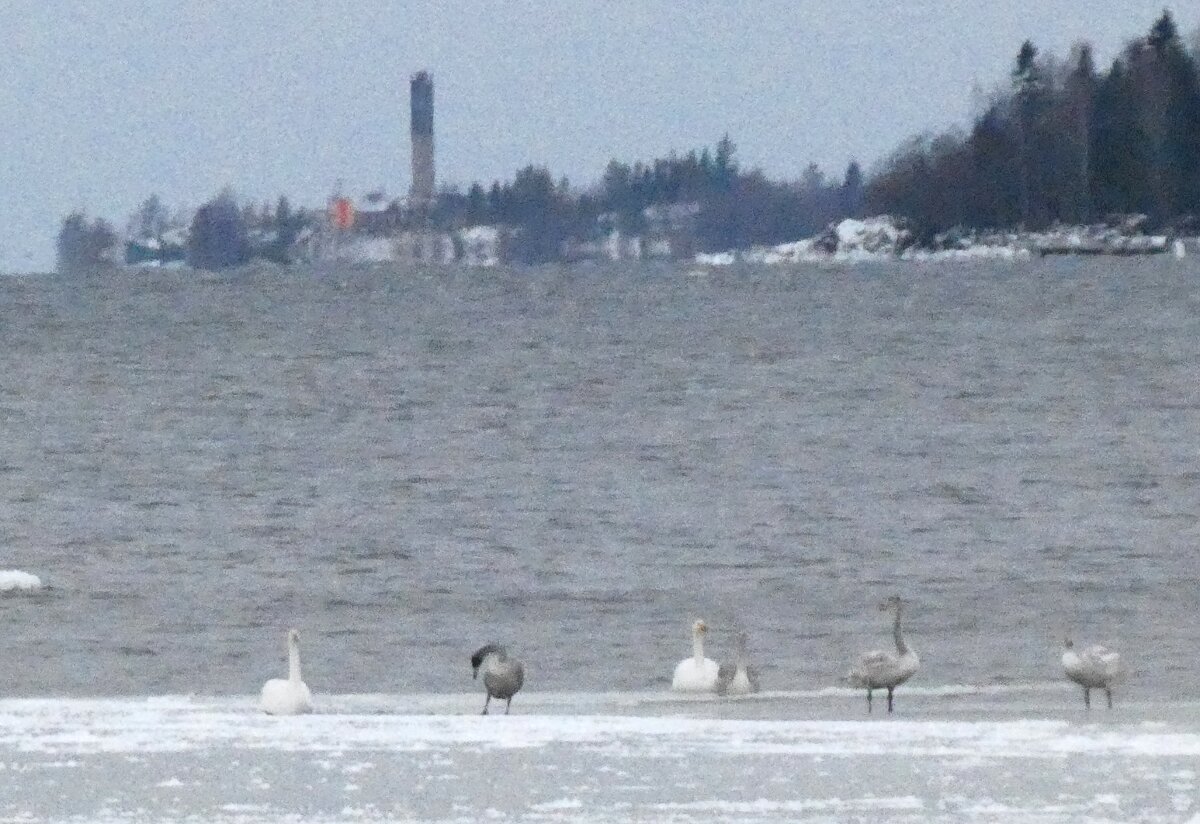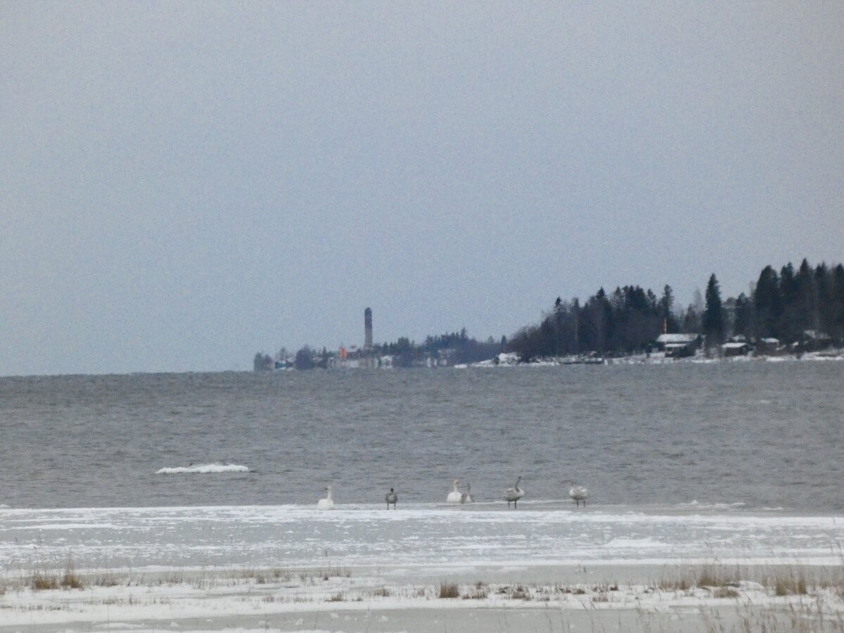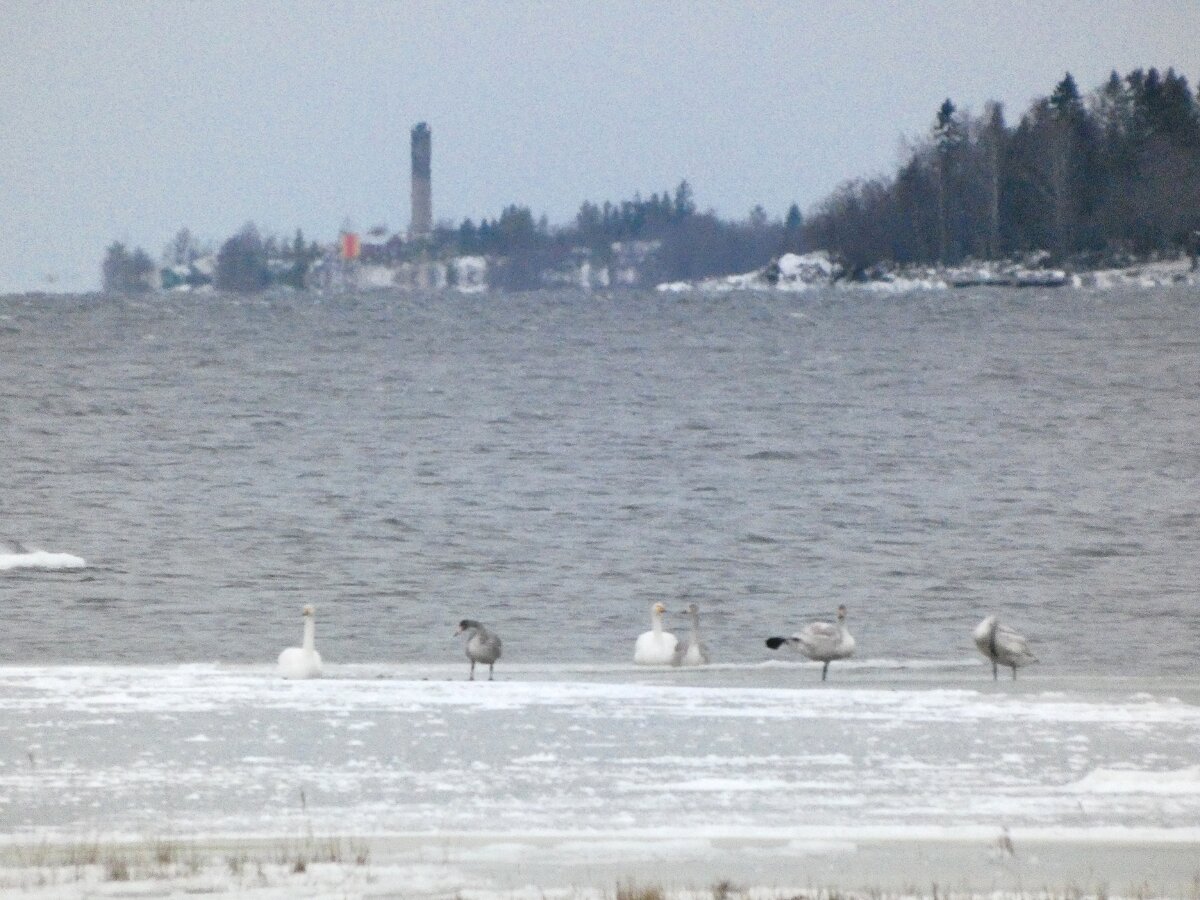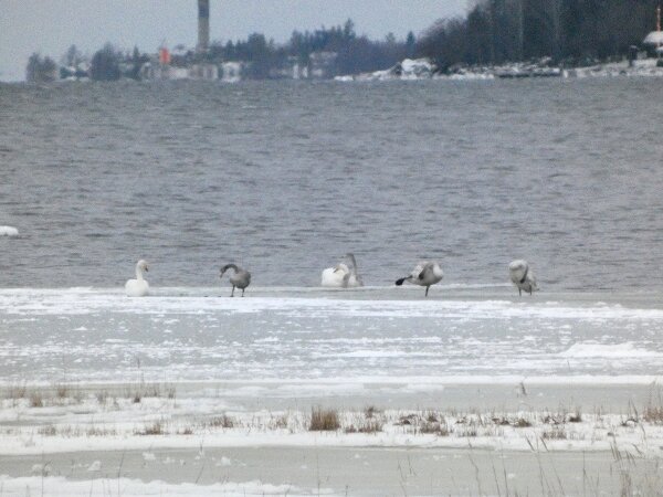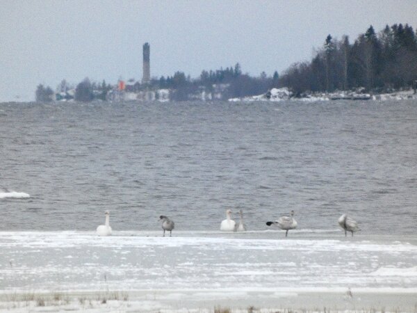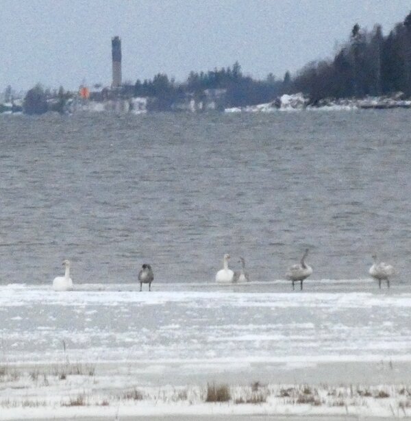 Tähystyspaikalta näkyi laulujoutsenperhe, jossa oli pienempi kokoinen, tummempi värinen poikanen kuin ottolapsena. Se on selvästikin eri laulujoutsenlajia, kuin perhe muuten. Kun laulujoutsenlintuja on todistetusti eri kokoisia, niin ehkäpä tuo pieni on ihan normaali sen lajiseksi poikaseksi joka se on? Joka tapauksessa pikkuinen oli ihan kuin perheen oikea jäsen. Harvemmin huomaa, että laulujoutsenlintuja on eri kokoisia ja eri tyyppisiä? Osaksi sen vuoksi, että samantyyppiset muuttavat samantyyppisten kanssa ja että idästä saapuu aina samantyyppisiä lintuja samaan aikaan? Myöskin siksikin on kokoeroa vaikea huomata, että vain hyvin harvoin ovat eri lajiset laulujoutsenet ihan vierekkäin ja siten, että kokoeron pystyy varmuudella huomaamaan. Myös on mielenkiintoinen asia, että eri lajisilla laulujoutsenilla on ilmeisestikin erilaiset äänet, jotka pysyisi harjaantumalla oppia tunnistamaan. Mutta tietenkin, jos vakaumus on, että on vain yhdenlaisia laulujoutsenia, niin tämä uskomus tietenkin estää oppimasta mitään tällaista? Jälleen olivat ehkäpä ne samat kaksi puukiipijälintua siellä luontopolun varrella? Ainakin oli jälleen toisella sellainen tarmokas, iskevät ti-ääni. Toisella oli vähän hämmästykseksi, kaikenlaisia erikoisia ääniä, joista osa muistutti tiaisen ääniä vähän. Koska paikalla selvästi oli vain kaksi puukiipijälintua eikä mitään muita lajeja, niin saattoi todeta, että näillä puukiipijälinnuilla oli sellaisiakin ääniä, joita ei ehkä tavallisesti tajuakaan puukiipijälinnuiksi silloin kun ne ovat tiaisparven yhteydessä. Mutta nyt pystyi olemaan varma, että jotkin tiaisenkaltaiset äänetkin olivatkin puukiipijälinnun ääniä.![]()