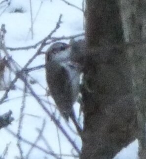 Sain vain tämän yhden kuvan puukiipijälinnusta. Tämä on pään sivun perusteella se toinen, ei ole se keltaoranssisiipijuovainen ainakaan, joka aiemmin havaittiin. Ihmetyttää tässä kuvassa, että miksi sillä ei näy siipijuovaa, joka on niinkin näkyvä yleensä. Onko siipijuovan edessä vaikkapa jokin kasvi, jota ei kuitenkaan pysty kuvasta huomaamaan? Onko olemassa idässä sellaisia puukiipijälintuja, joilla ei ole normaalia siipijuovaa?