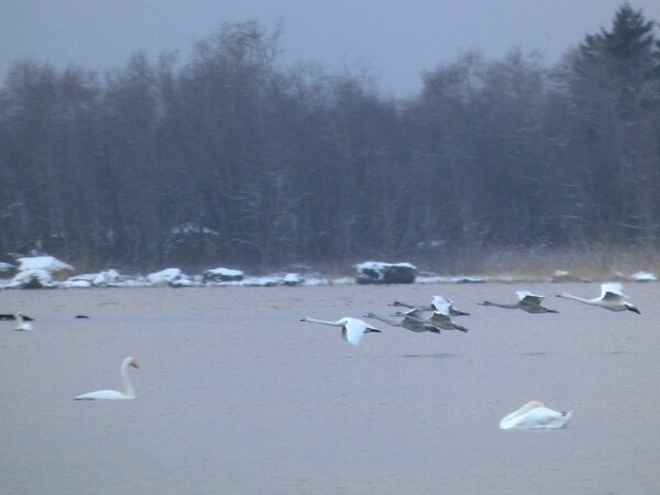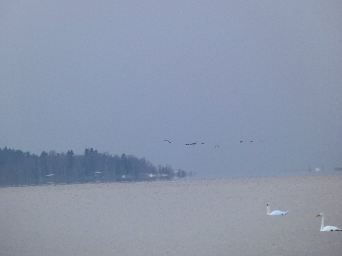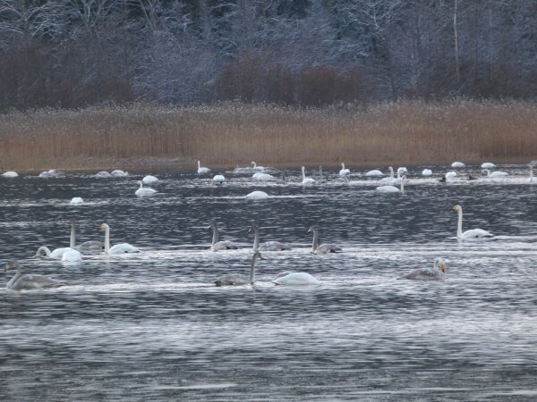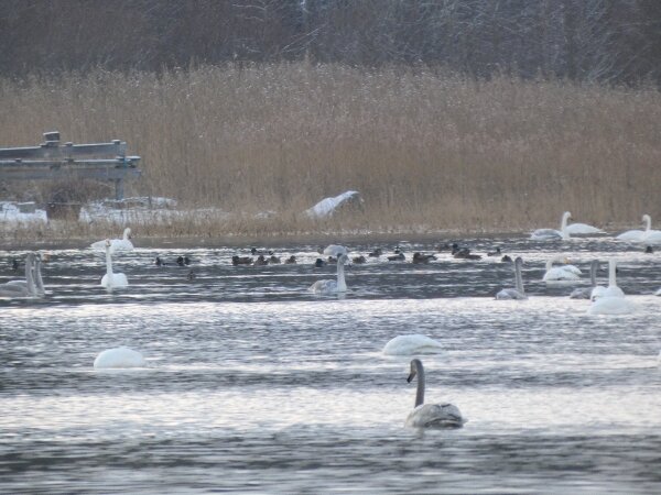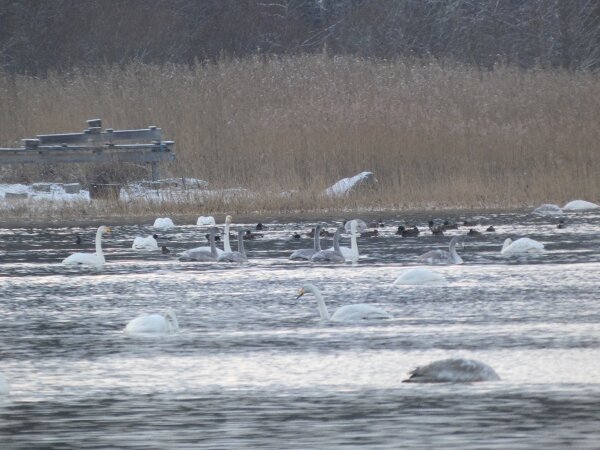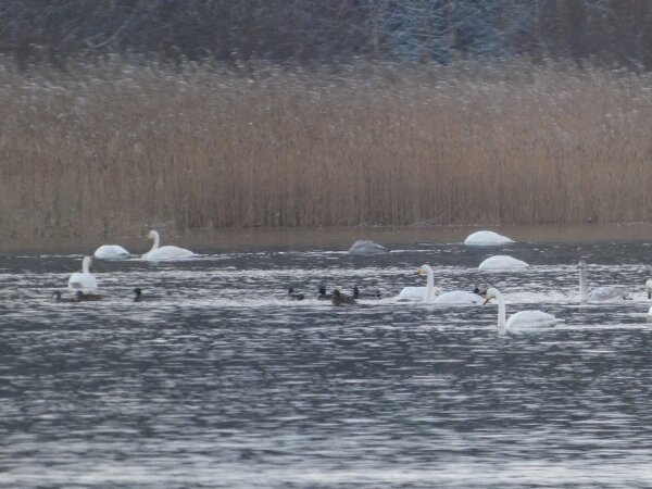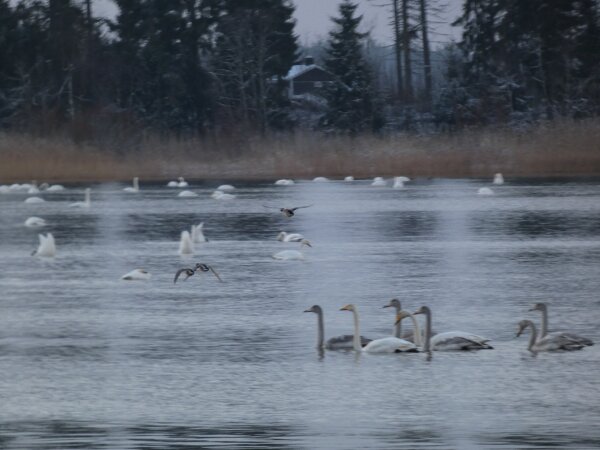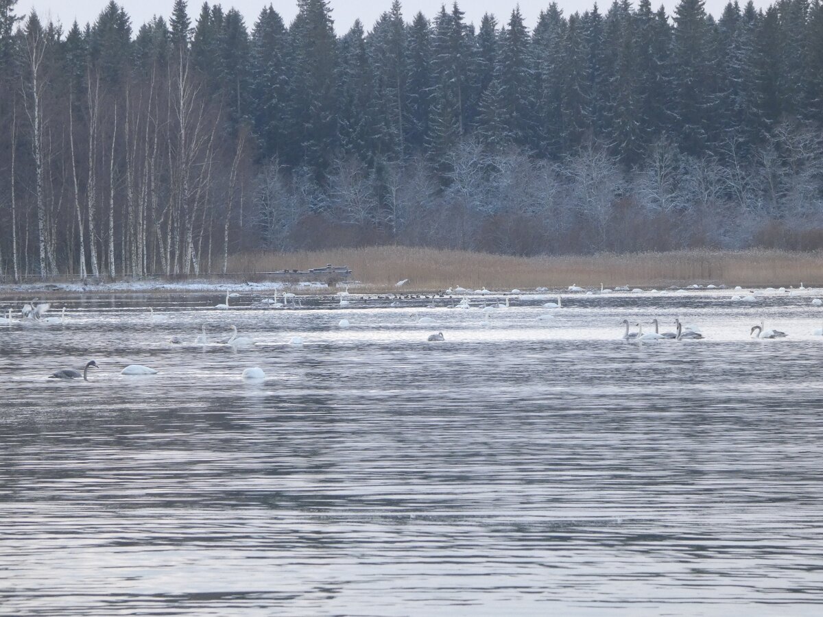 Tässä näkyy eilen löydettyjä laulujoutsenia lähempää kuin eilen. Yli kaksi sataa niitä ilmeisesti on ja parvessa on tavallista enemmän nuoria. 19+14 sinisorsalintua näkyi. Videolta voi katsoa, minkä tyyppisiä ne olivat. Ovat niitä pienempiä, pidempi nokkaisia, tumma päisiä? Naaraat siis ovat sellaisia. Neljä isokoskelolintua oli ja yksi sellainen liitolokkityyppinen lokki. Kyhmyjoutsenia oli 13. Ihmettelin, että ei ollut telkkiä eikä ollut haapanalintuja.![]()