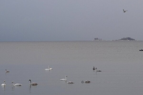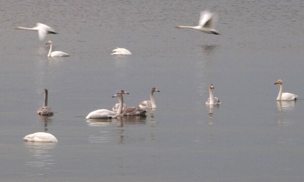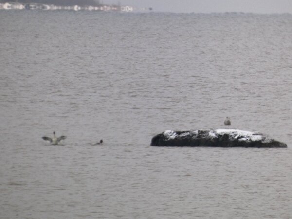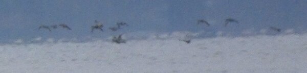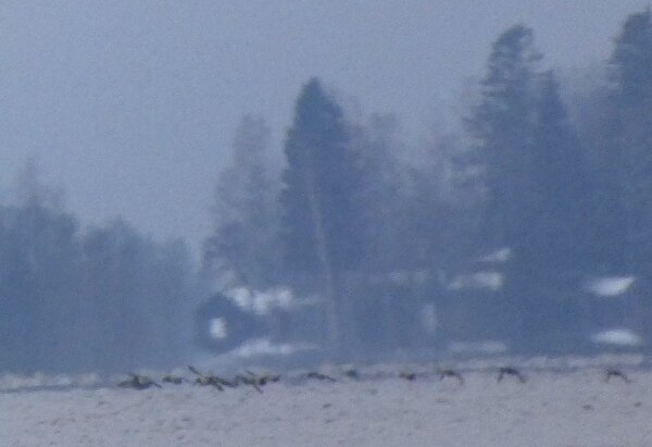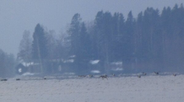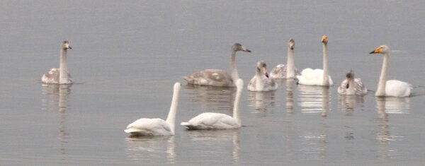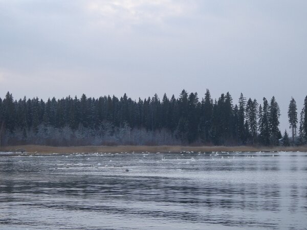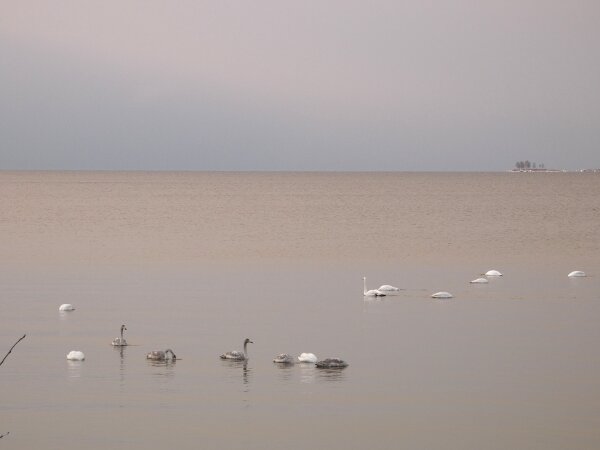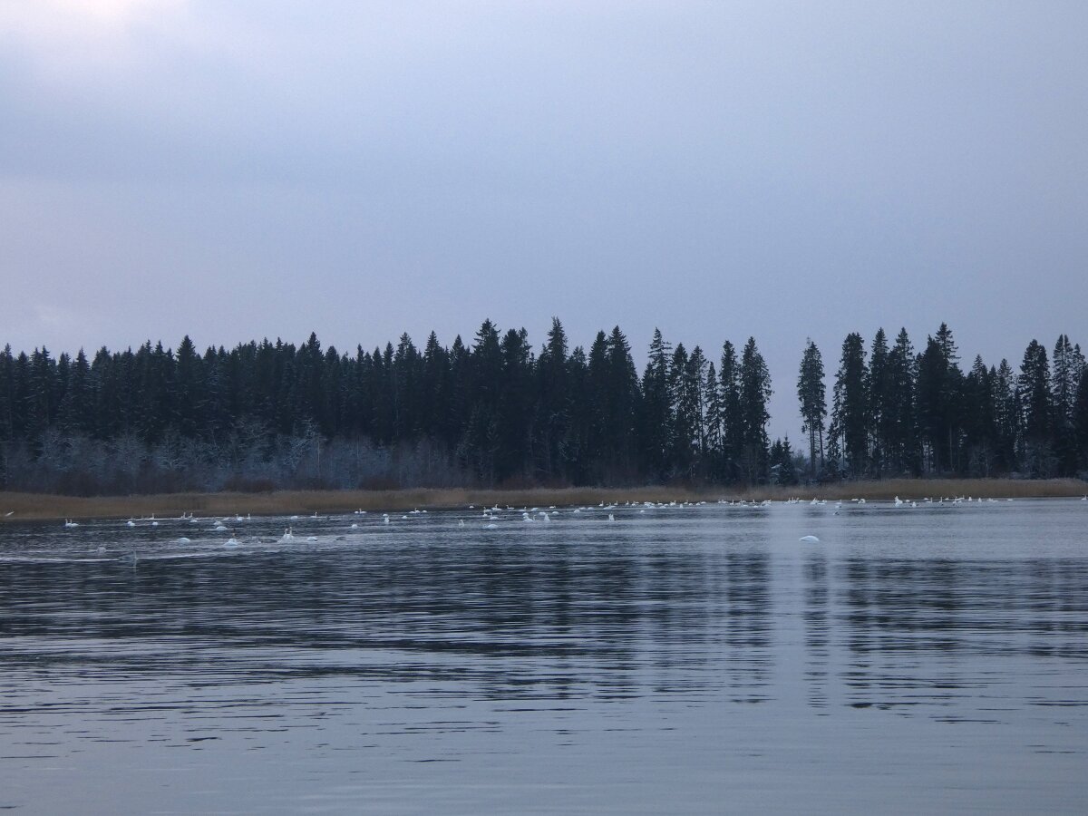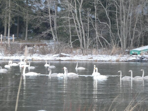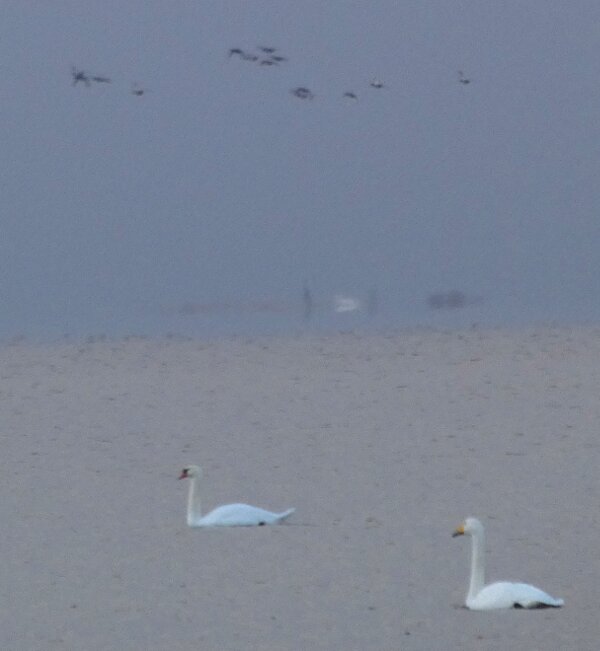 Tässä näkyy eilen löydettyjä laulujoutsenia lähempää kuin eilen. Yli kaksi sataa niitä ilmeisesti on ja parvessa on tavallista enemmän nuoria. 19+14 sinisorsalintua näkyi. Videolta voi katsoa, minkä tyyppisiä ne olivat. Ovat niitä pienempiä, pidempi nokkaisia, tumma päisiä? Naaraat siis ovat sellaisia. Neljä isokoskelolintua oli ja yksi sellainen liitolokkityyppinen lokki. Kyhmyjoutsenia oli 13. Ihmettelin, että ei ollut telkkiä eikä ollut haapanalintuja.![]()