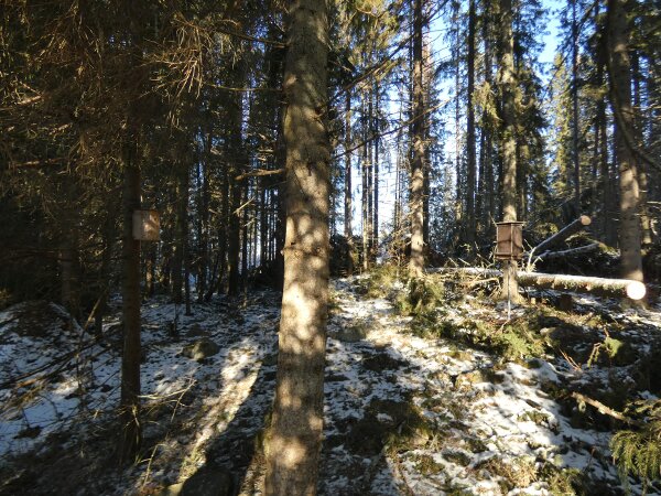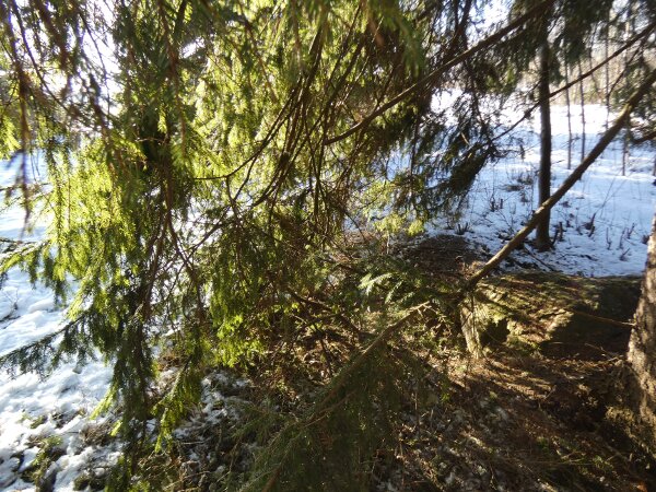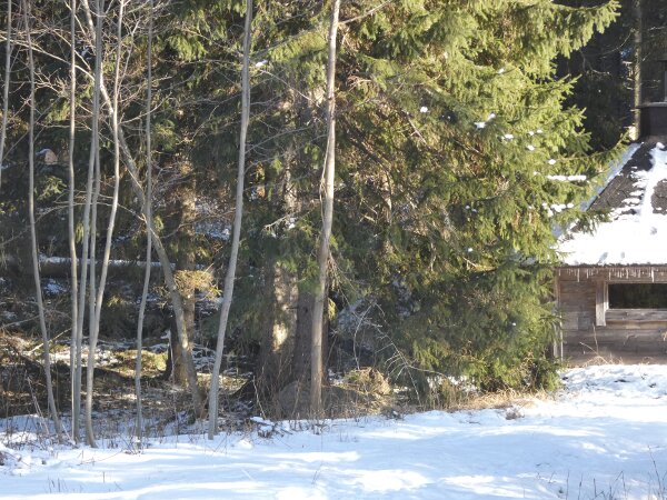 Pitäisi olla hyvä onni, että saisi siitä ääntelijästä kuvan. Tänään oli ruokinnalla ehkä samat linnut kuin eilenkin, mutta nyt katselin ruokintaa toiselta puolelta. Siitä näki paremmin koko alueen, jonne voisi olettaa sen rubiinisatakielen ilmaantuvan. Tuntui että tiaisia olisi ollut tänään vähän enemmän. Ne ottivat aurinkoa ja vähän ihmeekseni söivät ahkeraan lunta. Kun aurinko sulattaa kuusen oksilla lunta, niin ehkä sen lumen päällykerros on hyvä veden lähde pikkulinnuille. Tuntui, että tiaiset olivat tottuneet läsnäolooni ja ne olivat hyvin vilkkaalla tuulella. Puukiipijä oli tänäänkin ruokinnan puissa. Samoin punatulkkuja oli tänäänkin. Katselin nyt tarkemmin sitä paikkaa, josta sen ilmeisen rubiinisatakielen ääni kuului ensi kertaa paikalle saapuessa - siitä nuotiotuvan viereltä. Se kuului kovaan ääneen, kovempana paljon kuin niissä saaduissa äänitteisä. Siinä on hyvin lämmin ja suojainen lähes sula paikka ja siinä on suojaisia kuusen oksia. Lunta ei siinä ole.![]()