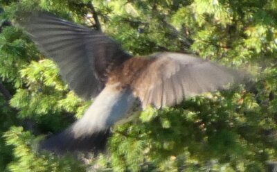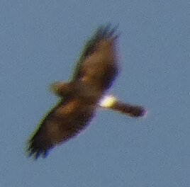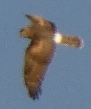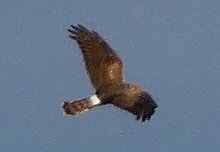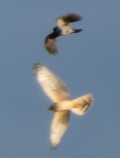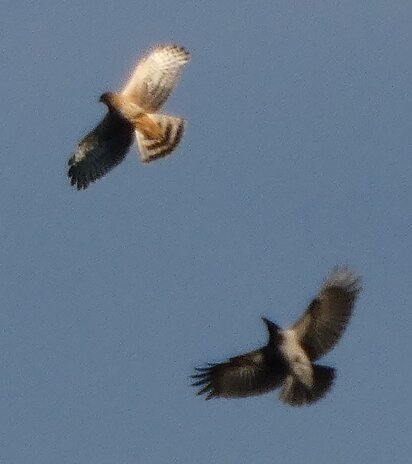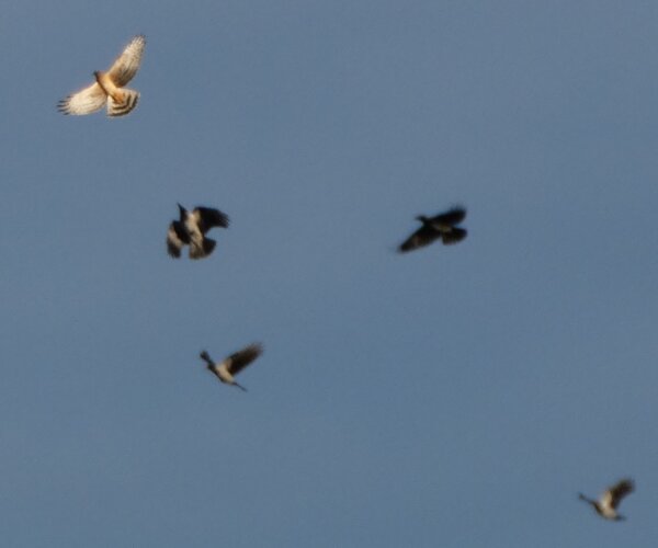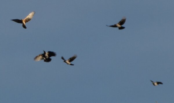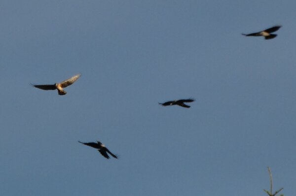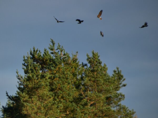 Nuori sinisuohaukka kuin leikkii varisten kanssa.