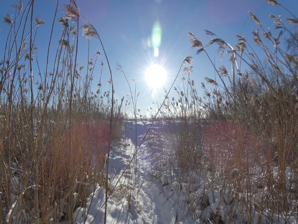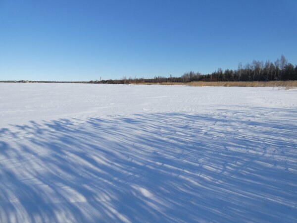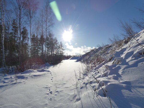 Tunnin lumenkahlaamiskävelyllä. Oli satanut 10 cm lunta. Mutta aurinko paistoi todella hienosti. isompi kuva, joka aukeaa uuteen ikkunaan Äänite: tuollaista sinitiaislinnun ääntelyä