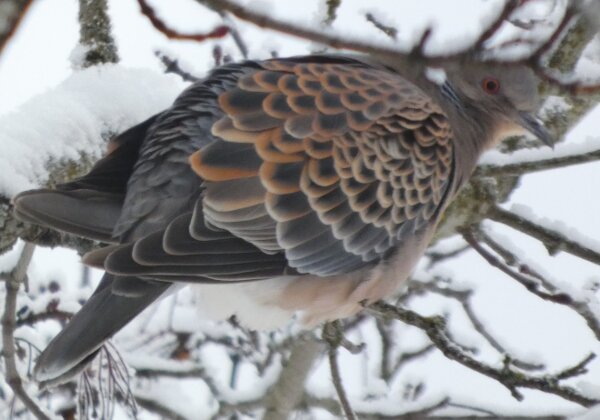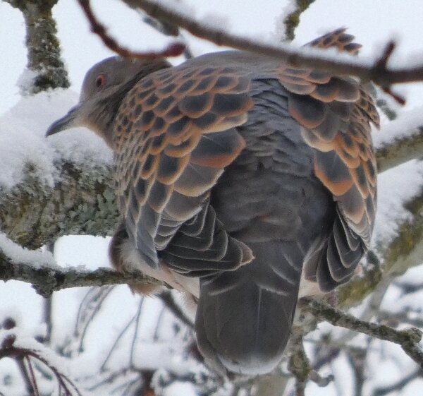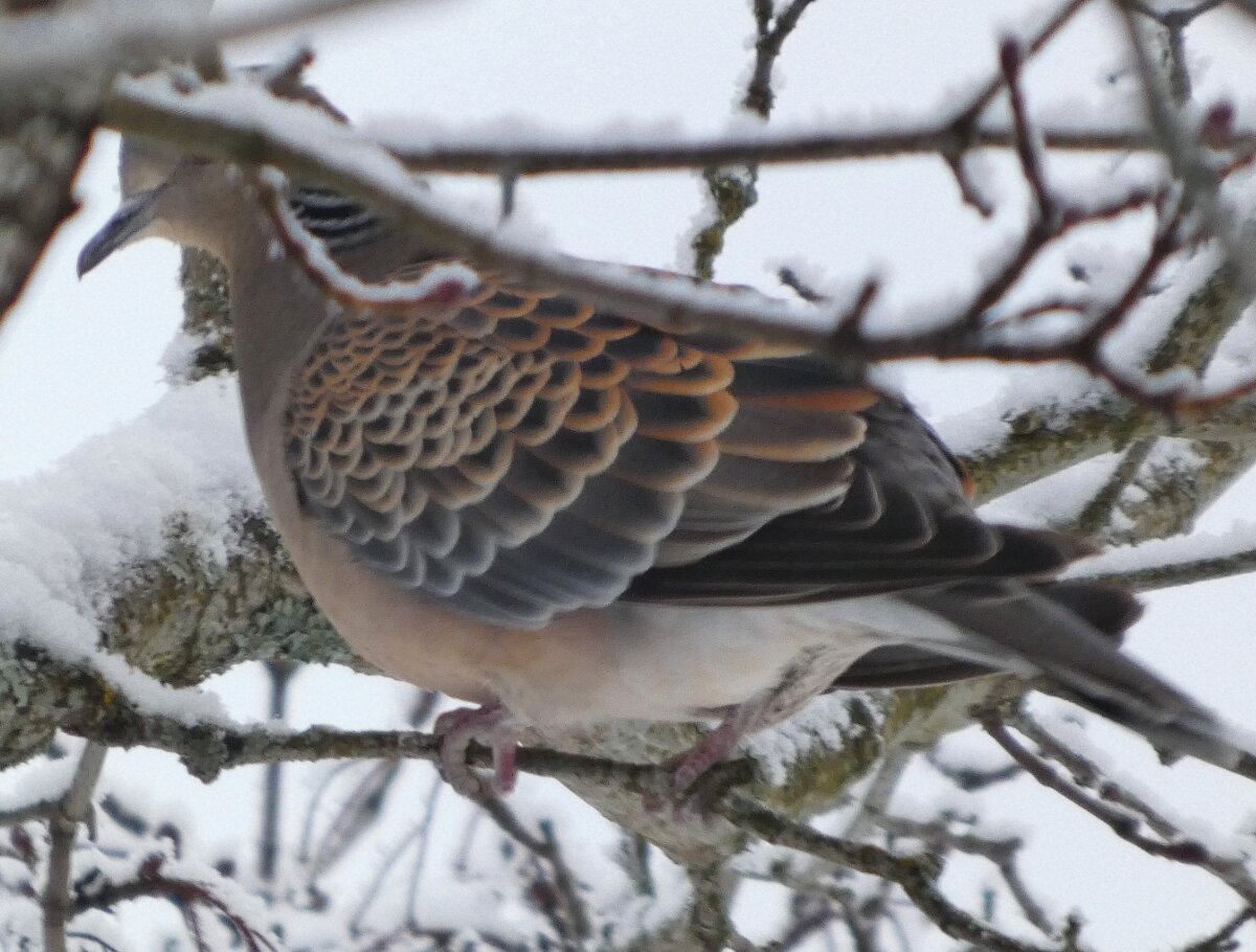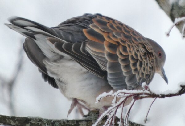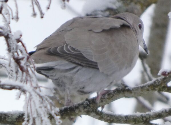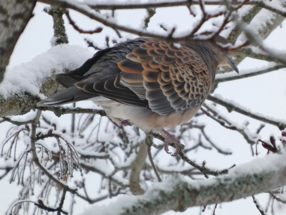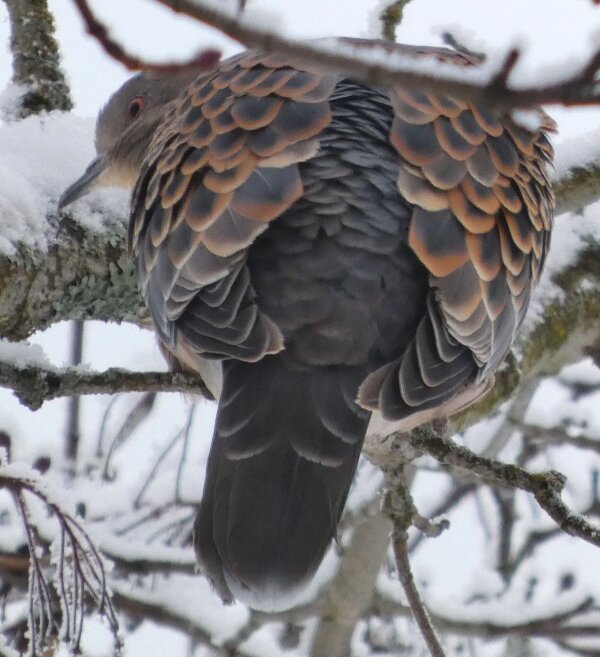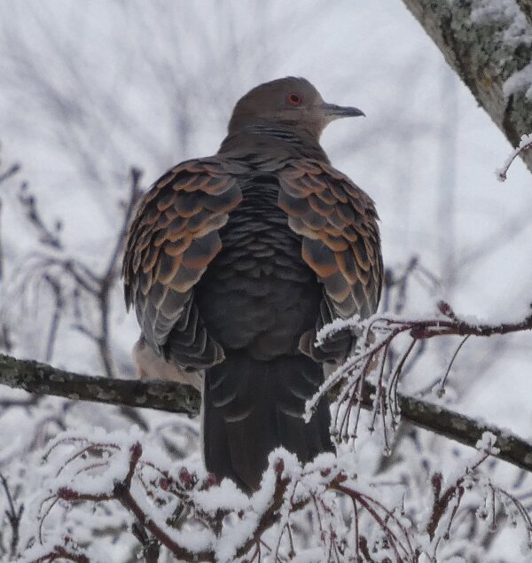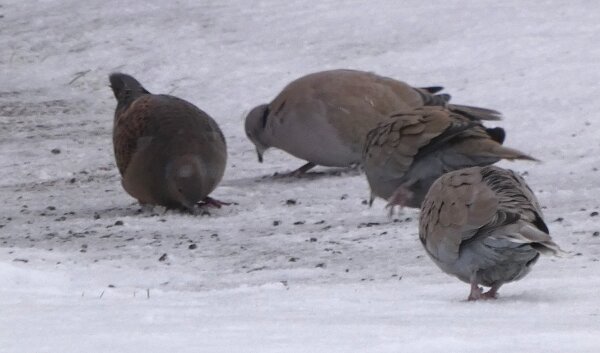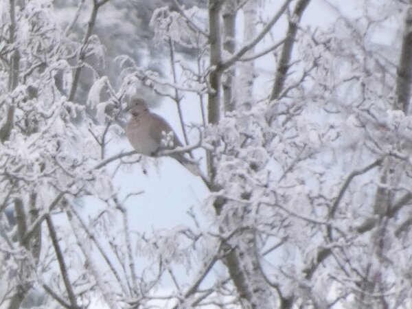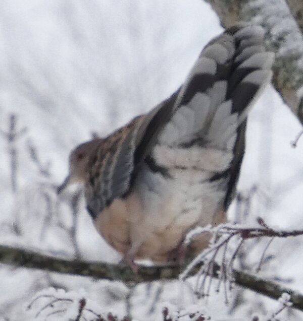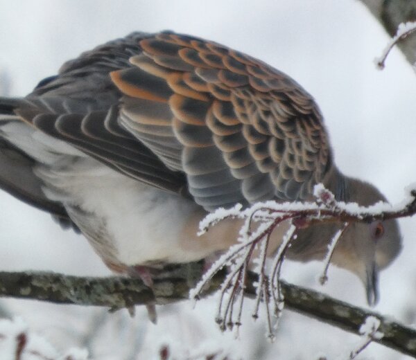 Löytyi pienten vaaleanpunaisten pikkukyyhkysten havaintopaikalta idänturturikyyhky. Kyyhkyset olivat tällä kertaa tien vieressä pensasmaisessa puussa. Kun siinä niitä läheltä kuvasin, niin yhtäkkiä lensi siihen ihan viereen idänturturikyyhky. Heti sen näki jo lennossa, että mikä nyt tuli paikalle. Se on aika paljon tummempi väritykseltään, mutta yllättäen melkein pienen vaaleanpunaisen kyyhkysen kokoinen. Se oli aivan kesy. Näytti että se oli hyväksytty vaaleanpunaisten pikkukyyhkysten parven jäseneksi. Se liikkui niiden kanssa. Oli aika hienoa, kun tuollainen harvinaisuus lensi yhtäkkiä aivan odottamatta ihan lähelle. Arvelen, että se on meenaksi luettava, vaikka sillä on joitakin nimilajinkin piirteitä mielestäni. Siis kysehän on siitä, kuka päättää, mikä on tärkeätä. Saatavilla olevan lehikoisen määritysartikkelin perusteella meena. Se tietenkin herättää heti huomiota, että osa sen selkäpuolen höyhenistä on uusia - osa vanhoja höyheniä, jne? Vähän ihmettelin, kun kyyhkyset söivät tänään niin innokkaasti lunta. Nyt oli satanut uutta, puhdasta lunta ja sitä ne janoonsa söivät? Siellä punaisen havaintotornin rannalla oli kymmenen pulmusta ja ne nousivat sieltä rannalta ilmeisestikin ja lensivät ihan tornin ylitse läheltä, kun olin siellä ylhäällä tähystelemässä. Siis vihdoin löytyi talviset pulmusetkin tänäkin vuonna.![]()
