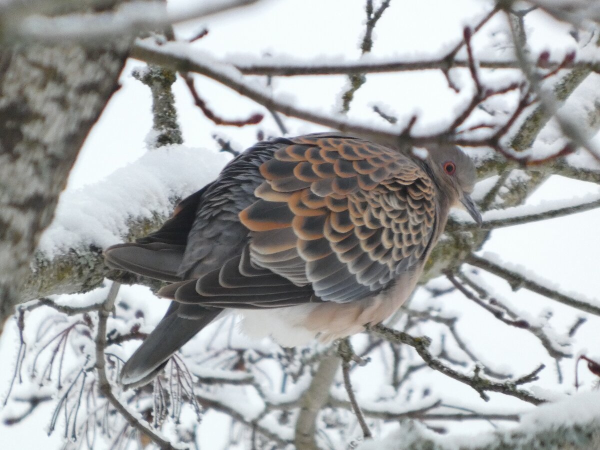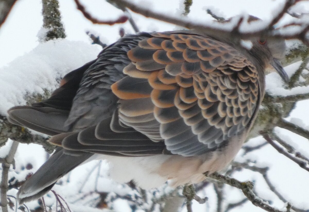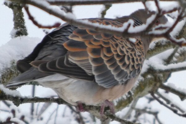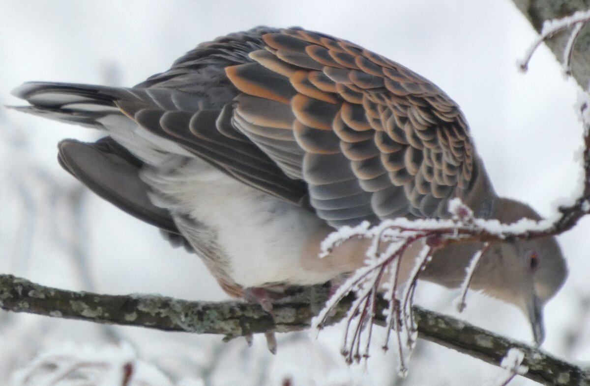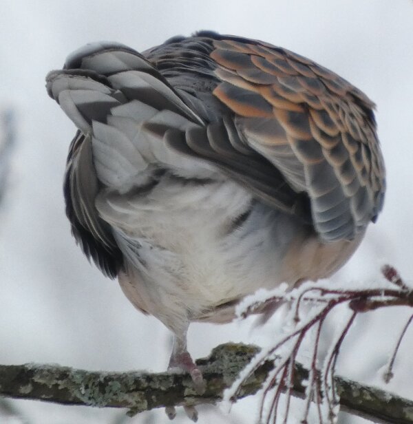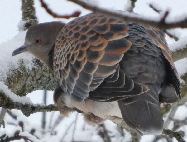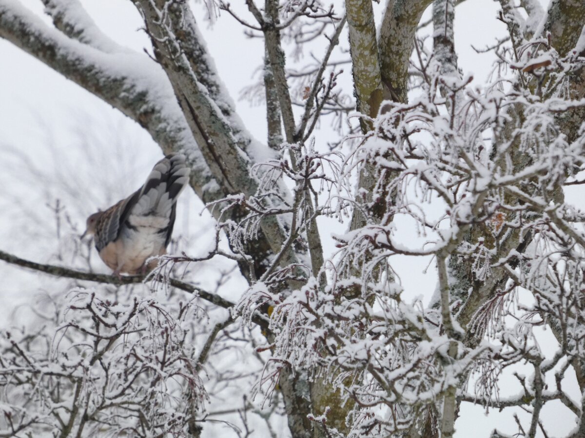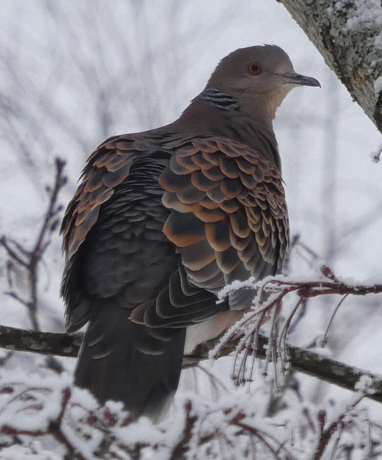 Löytyi pienten vaaleanpunaisten pikkukyyhkysten havaintopaikalta idänturturikyyhky. Kyyhkyset olivat tällä kertaa tien vieressä pensasmaisessa puussa. Kun siinä niitä läheltä kuvasin, niin yhtäkkiä lensi siihen ihan viereen idänturturikyyhky. Heti sen näki jo lennossa, että mikä nyt tuli paikalle. Se on aika paljon tummempi väritykseltään, mutta yllättäen melkein pienen vaaleanpunaisen kyyhkysen kokoinen. Se oli aivan kesy. Näytti että se oli hyväksytty vaaleanpunaisten pikkukyyhkysten parven jäseneksi. Se liikkui niiden kanssa. Oli aika hienoa, kun tuollainen harvinaisuus lensi yhtäkkiä aivan odottamatta ihan lähelle. Arvelen, että se on meenaksi luettava, vaikka sillä on joitakin nimilajinkin piirteitä mielestäni. Siis kysehän on siitä, kuka päättää, mikä on tärkeätä. Saatavilla olevan lehikoisen määritysartikkelin perusteella meena. Se tietenkin herättää heti huomiota, että osa sen selkäpuolen höyhenistä on uusia - osa vanhoja höyheniä, jne? Vähän ihmettelin, kun kyyhkyset söivät tänään niin innokkaasti lunta. Nyt oli satanut uutta, puhdasta lunta ja sitä ne janoonsa söivät? Siellä punaisen havaintotornin rannalla oli kymmenen pulmusta ja ne nousivat sieltä rannalta ilmeisestikin ja lensivät ihan tornin ylitse läheltä, kun olin siellä ylhäällä tähystelemässä. Siis vihdoin löytyi talviset pulmusetkin tänäkin vuonna.![]()