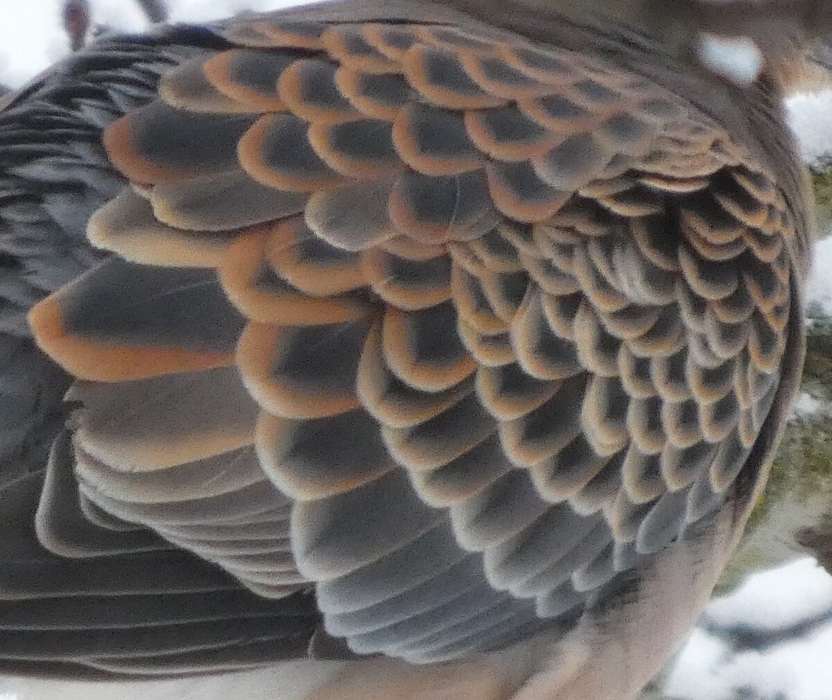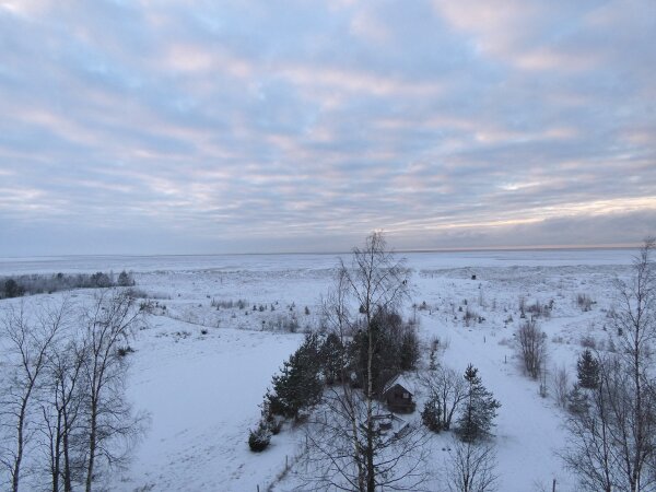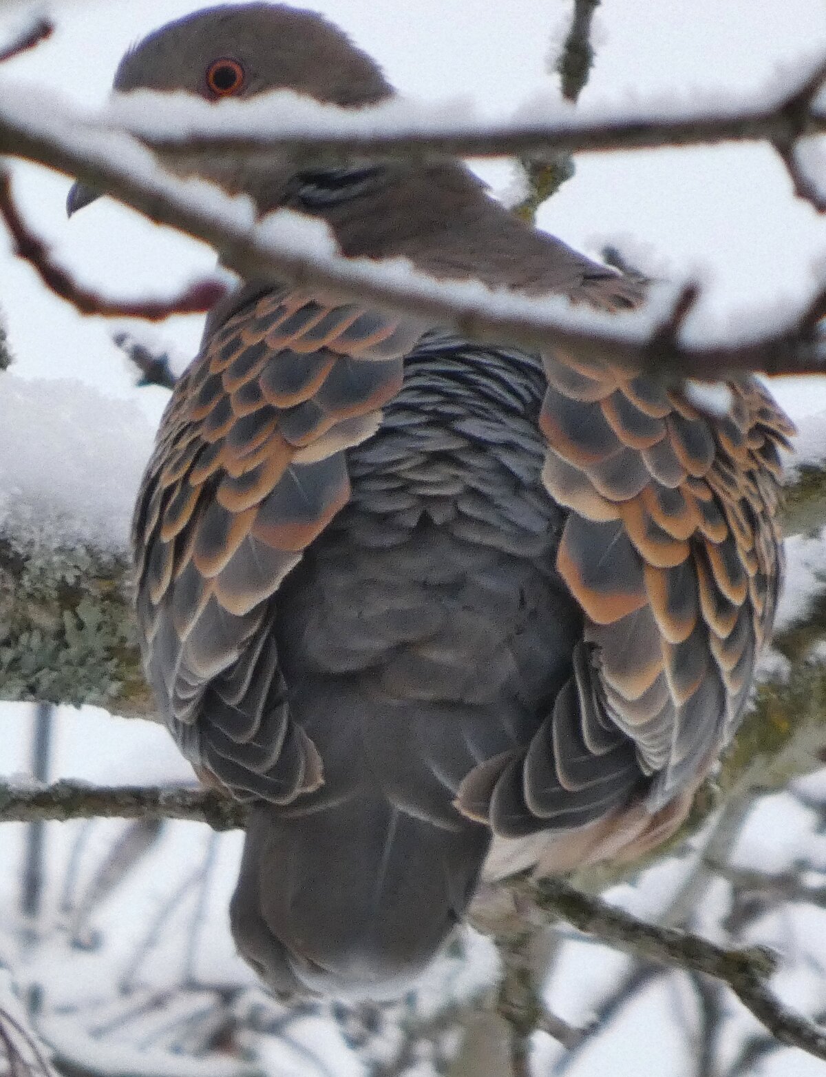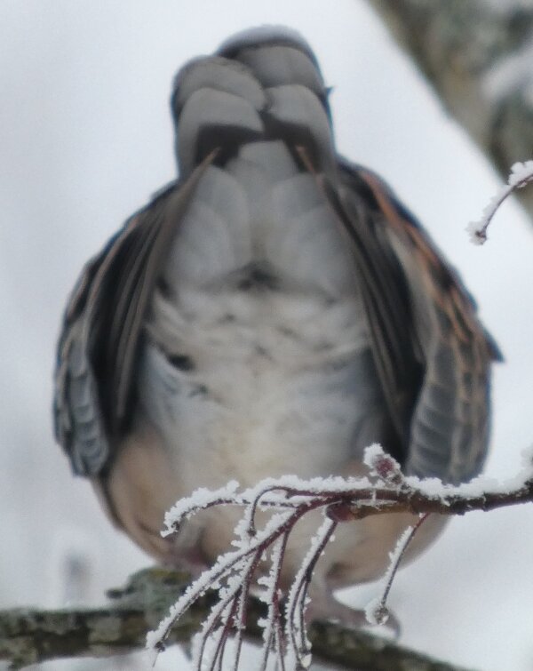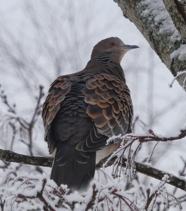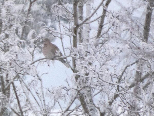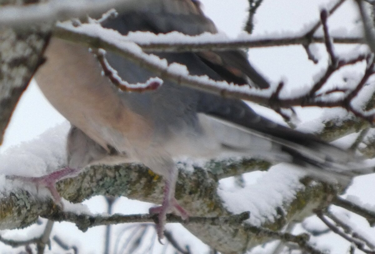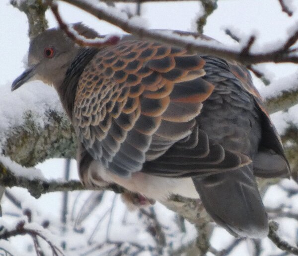 Löytyi pienten vaaleanpunaisten pikkukyyhkysten havaintopaikalta idänturturikyyhky. Kyyhkyset olivat tällä kertaa tien vieressä pensasmaisessa puussa. Kun siinä niitä läheltä kuvasin, niin yhtäkkiä lensi siihen ihan viereen idänturturikyyhky. Heti sen näki jo lennossa, että mikä nyt tuli paikalle. Se on aika paljon tummempi väritykseltään, mutta yllättäen melkein pienen vaaleanpunaisen kyyhkysen kokoinen. Se oli aivan kesy. Näytti että se oli hyväksytty vaaleanpunaisten pikkukyyhkysten parven jäseneksi. Se liikkui niiden kanssa. Oli aika hienoa, kun tuollainen harvinaisuus lensi yhtäkkiä aivan odottamatta ihan lähelle. Arvelen, että se on meenaksi luettava, vaikka sillä on joitakin nimilajinkin piirteitä mielestäni. Siis kysehän on siitä, kuka päättää, mikä on tärkeätä. Saatavilla olevan lehikoisen määritysartikkelin perusteella meena. Se tietenkin herättää heti huomiota, että osa sen selkäpuolen höyhenistä on uusia - osa vanhoja höyheniä, jne? Vähän ihmettelin, kun kyyhkyset söivät tänään niin innokkaasti lunta. Nyt oli satanut uutta, puhdasta lunta ja sitä ne janoonsa söivät? Siellä punaisen havaintotornin rannalla oli kymmenen pulmusta ja ne nousivat sieltä rannalta ilmeisestikin ja lensivät ihan tornin ylitse läheltä, kun olin siellä ylhäällä tähystelemässä. Siis vihdoin löytyi talviset pulmusetkin tänäkin vuonna.![]()