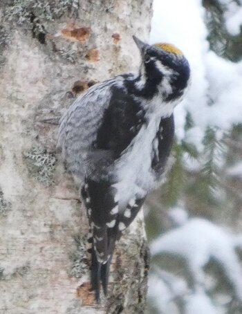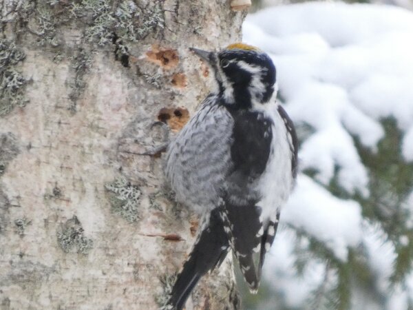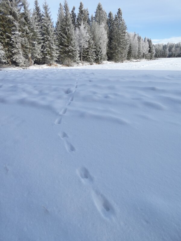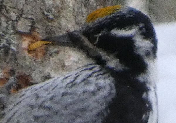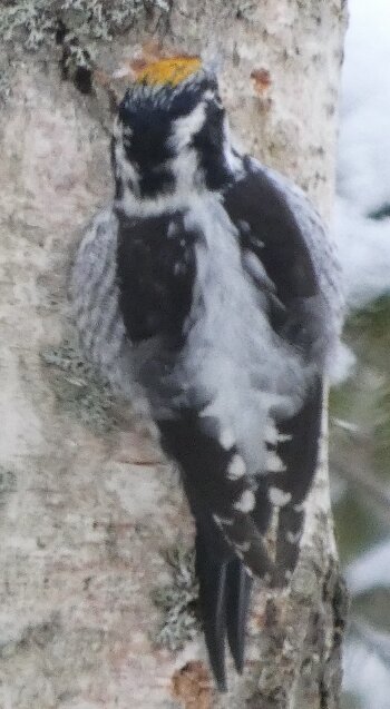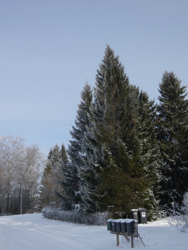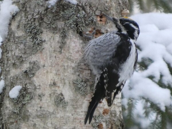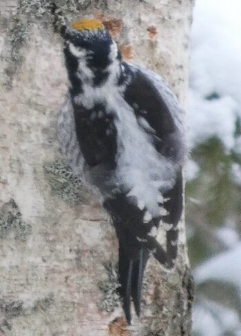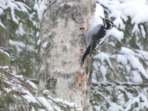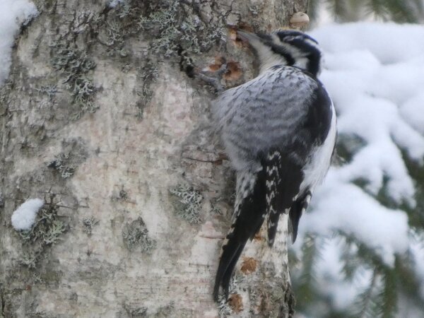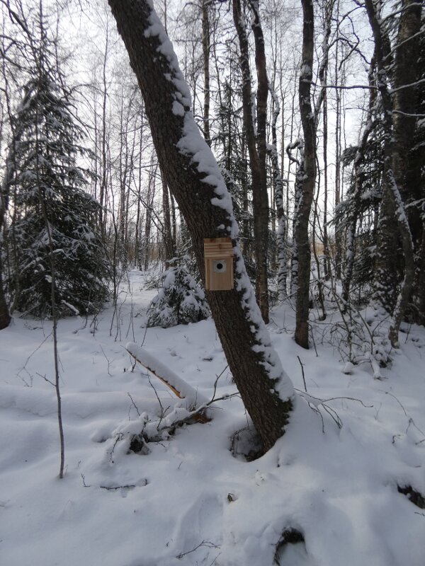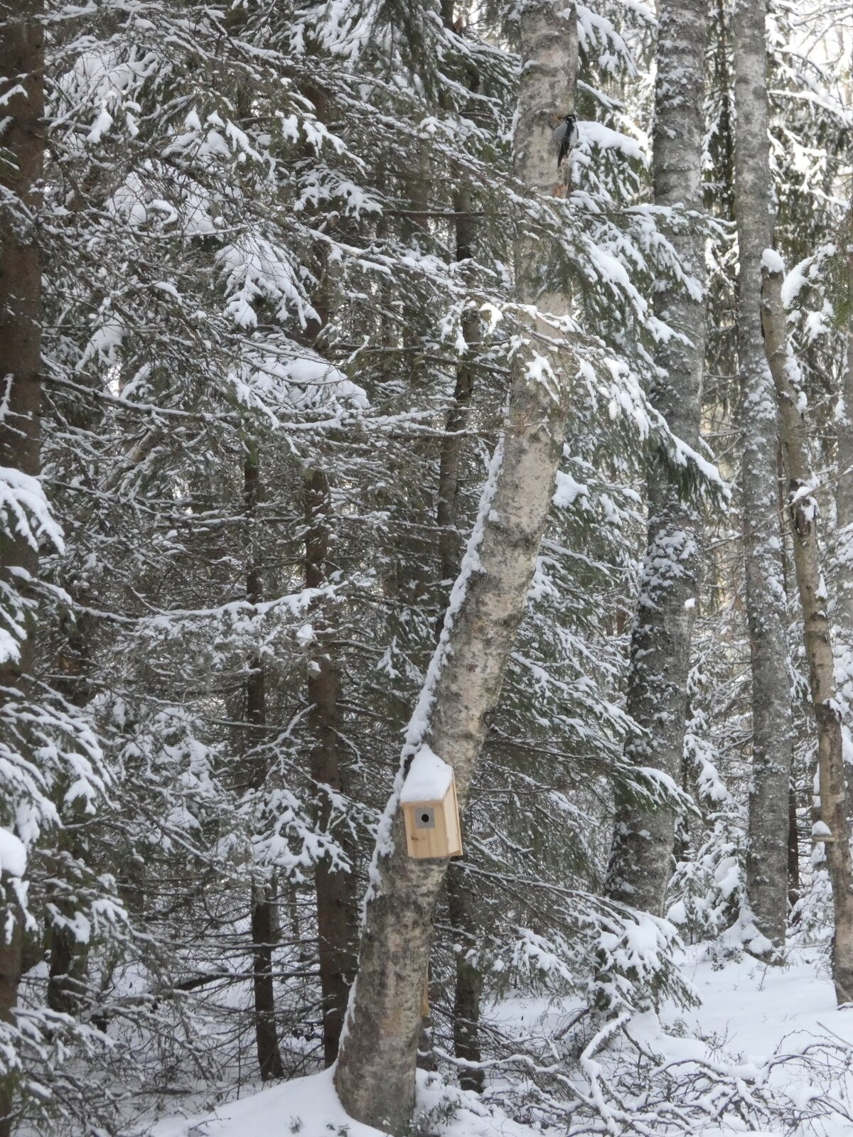 Sitä kolmannen laitetun pöntön pönttöpuuta puhdisti loisista tänään pohjantikka. Ja se oli siinä koko ajan. Mutta se ei ollut se sama pohjantikka, joka näkyi aiemmin. Jolla oli niitä kellanruskeita ilmeisesti nuoruushöyheniä päälaen keltaisten höyhenten joukossa. Tällä oli keltaisia höyheniä vain päälaella. Ja tämä myös vaikutti kesymmältä ja oli ihan rauhallinen ja koko ajan samassa kohdassa puuta suunnilleen. Se työskenteli rauhallisesti ja määrätietoisesti. Sen oikeata siipeä kutitti sisäpuolelta. Pohjantikka tekee puiden kuoriin tähystysreikiä. Niistä se kartoittaa ympäristön ruokatoukat. Tuossa yhdessä kuvassa tikka vetää sellaisen valkoisen ison toukan puun sisältä ruuakseen. Retkellä tuli kolmen linnun voimin todisteita siitä ilmiöstä, että linnut nyt paljolti ainakin keskipäivällä, jos aurinko paistaa, siirtyvät mahdollisille reviireilleen laulamaan. Sinne pönttöjen luokse oli jo ilmestynyt kaksi talitiaista pitämään reviiriä?! Ja punatulkku lauloi luontopolun varrella. Sen laulu oli erilaista kuin mitä on tänä talvena aiemmin kuulunut. Lauluu kuului erikoisia "näppäilyjä" ja esimerkiksi tulii-ääniä. Äänite: tulii laulava punatulkku kuusimetsässä, joka sopisi hyvin punatulkun reviiriksi? Tänne on saapunut tulii-punatulkkuja. Onko saapunut osa niistä aiemmista tulii-punatulkuista nyt tänne pesimään. Ovat silloin kartoittaneet hyviä pesimäpaikkoja, silloin aiemmin? Ja nyt ovat tulleet katsomaan niitä paikkoja. Että olisiko niissä saavutettavissa pesintä naaraan kanssa. Äänite: tässä on niiden kahden itse tehdyn pöntön luona talitiainen Äänite: ja tässä on toiseksi ja kolmanneksi laitettujen pönttöjen välillä talitiainen Taustalla kuuluu se pohjantikka, joka ruokaili siinä kolmannen pöntö pönttöpuussa. Sen ruokailukoputuksia.Näätä?