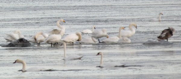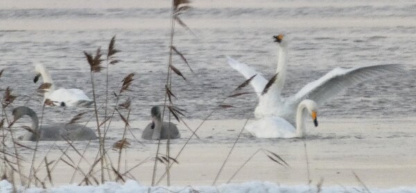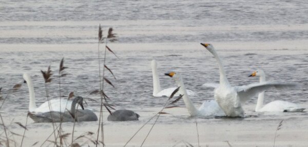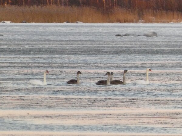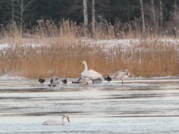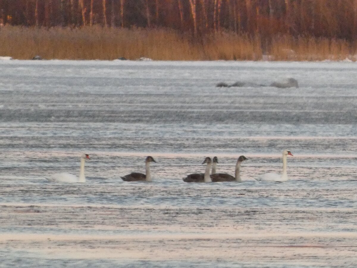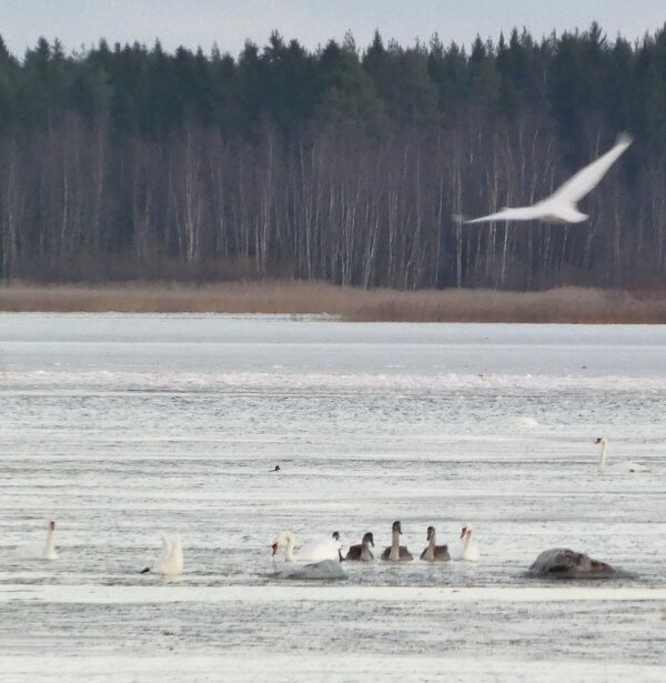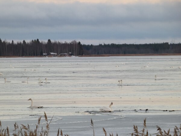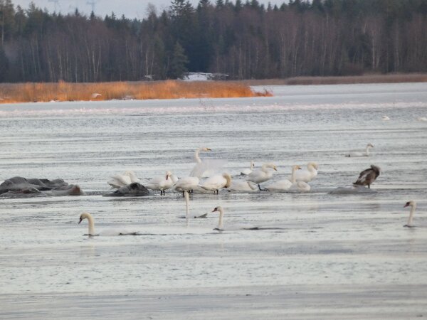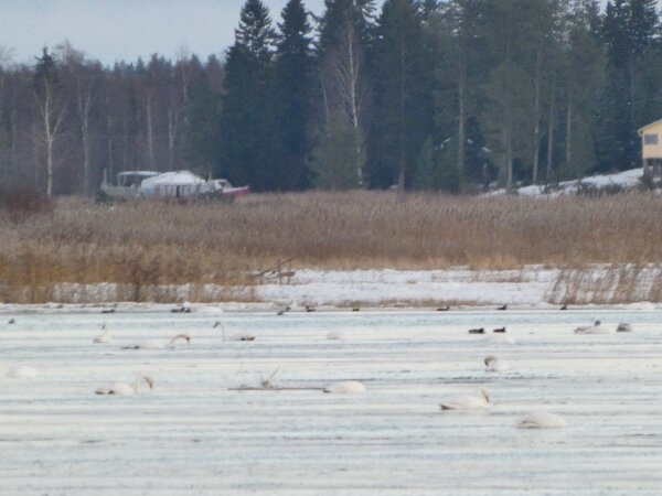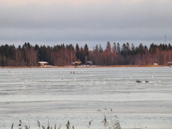 Video: oho räkättirastas ison niemen kärkiosassa puolukoita syömässä Ei ole pitkään aikaan räkättirastaita näkynyt. Viimeisimmät rastashavainnot taitavat olla se laulurastas ja kolme keltanokkarastasta. Video: telkkä sulavasti aalloilla ui Video: minkälaista oli saaren ruokinnalla katselemaan tullessa Video: nyt sinne on saapunut tuollainen oranssipääkerttu Tänään oli hyvällä joutsenpaikalla ehkä noin 60 kyhmyjoutsenta - ehkä jopa enemmän. Siis oli tullut kyhmyjoutsenia lisää. Mahdollisesti tämä oli seurausta siitä minkälaisiksi ruokailupaikat olivat tulleet pohjoisempana. Tai en tiedä voivatko ne tulla jopa sieltä valkomereltä (vienanmeri?). Siis arviolta ehkä jopa kolmannes joutsenlinnuista olikin yhtäkkiä kyhmyjoutsenia. Kyhmyjoutsenet ovat yhtä karaistuneita kuin laulujoutsenet? Sellaisen huomion arvelin, että kyhmyjoutsennuoren ei tarvitse olla kovin suuri kokoinen päästäkseen lentoon. Vaan että sillä pitää olla vain pitkät siipisulat ja että se on voinut harjoitella tarpeeksi (hieman). Siis kun näkyi oliko se eilen sellainen poikanen, joka näytti olevan lentokykyinen siipisuliltaan, niin se ei ollut kuin ehkä 70 prosenttia emänsä koosta. Siis samaan tapaan kuin hanhilla, joilla monasti lentokykyiset poikaset ovat alkuvaiheissaan paljon aikuisia pienempiä, usein. Ehkä kyhmyjoutsenen poikasilla kasvaa siipisulat nopeutetusti, jos se on niille tarpeen. Ne kerkiävät kyllä saada sitten kokoa, kun pääsevät etelämmäksi syömään.