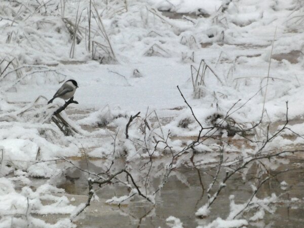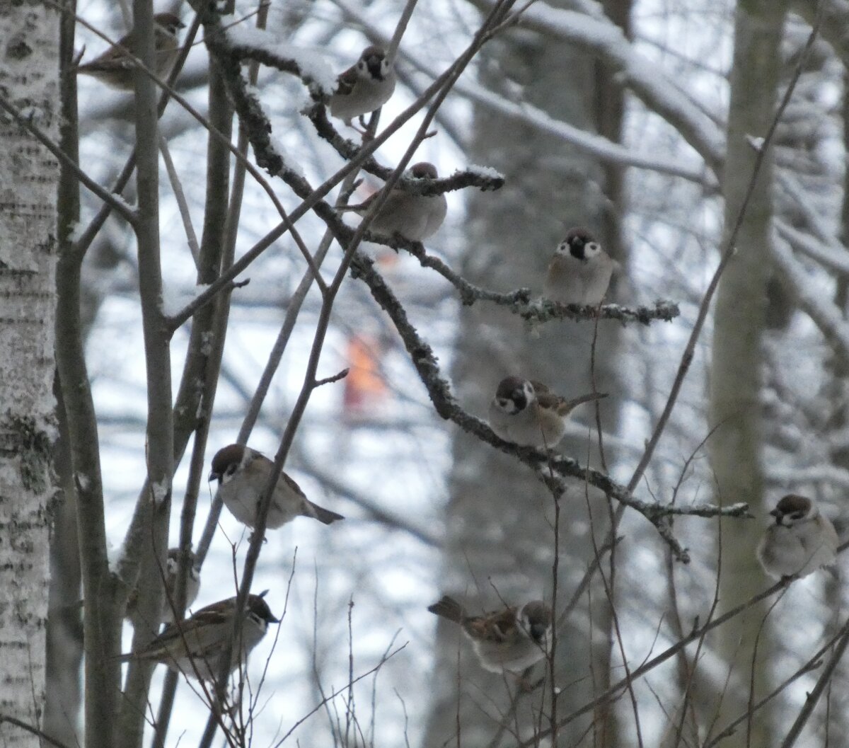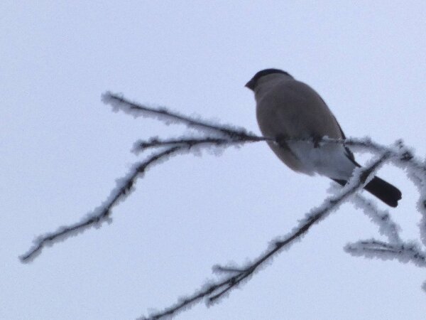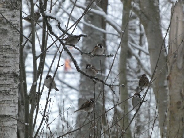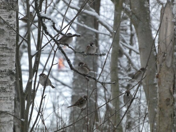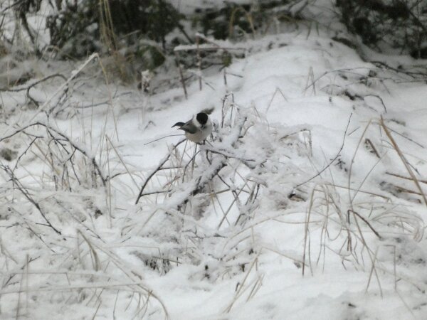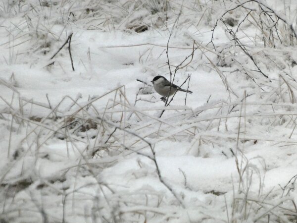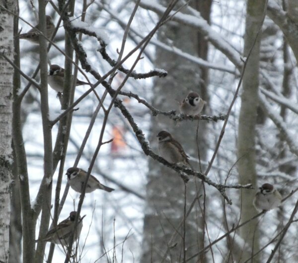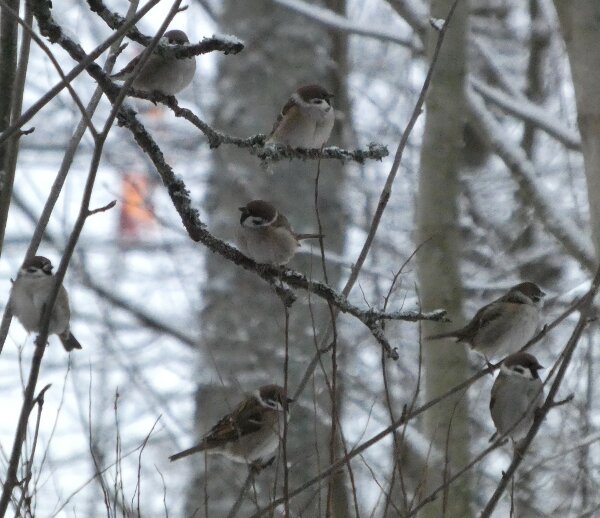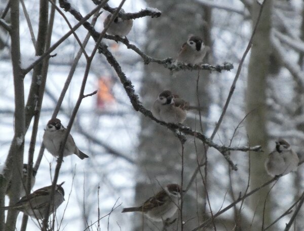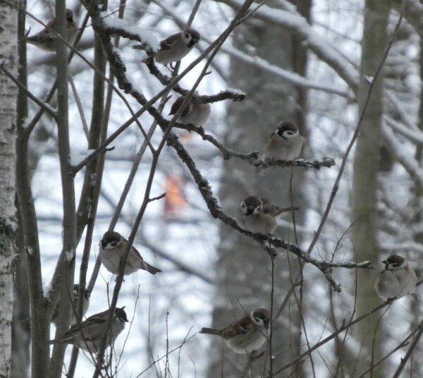 Siellä haarapääskysen pesäpaikan luontopolulla on ollut havaintojen mukaan neljä pyrstötiaista. Ja niin oli tänäänkin vanhan lintutornin luona neljä pyrstötiaista. Ne olivat aika kesyjä ja poimivat siitä jäätyneestä vedestä, sen pinnalta jotain mikroskooppisia siemeniä tai pikkueläimiä? Niiden kanssa oli hömötiaisen kokoinen talitiainen. Pääsin vertaamaan niitä, kun ne olivat hetken lähekkäin. Kun tulin sitten takaisin päin sieltä viiksitimalipaikalta, niin yllätykseksi pyrstötiaisten määrä olikin kaksinkertaistunut. Niitä oli ainakin kahdeksan. Parveen oli ehkä sillä välin liiittynyt toinenkin neljän pyrstötiaisen perheryhmä? Ja yksi hömötiainenkin oli tullut lisää? Ihmettelin heti, ennen kuin pääsin laskemaan parven lintuja sitä, että parvessa oli uudenlainen äänityyppi, jota ei ollut noin puolituntia sitten, kun niitä oli neljä. Sellaisia tarmokkaampia, sähköisempiä, niitä kuin voimalinjan ääniä oli ilmestynyt parven äänimaailmaan. Kun sitten pääsi ne laskemaan (niitä saattoi olla enempikin kuin kahdeksan, mutta ainakin kahdeksan niitä oli), niin päätelmä ilmeisesti on, että ne uudet äänet olivat parveen liittyneen uuden linnun ääniä.![]()