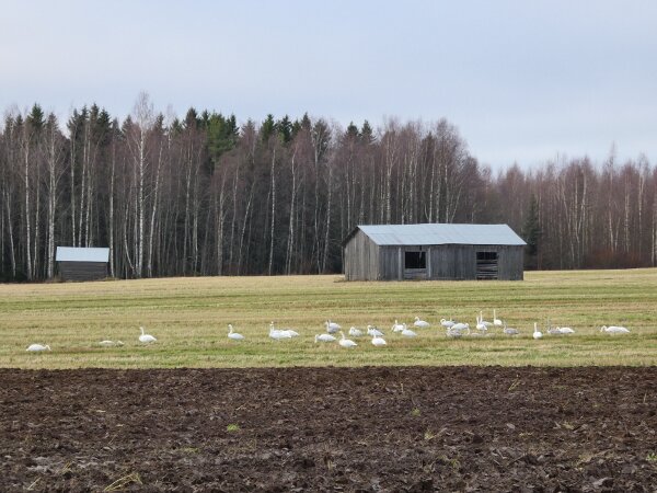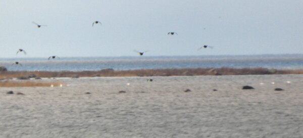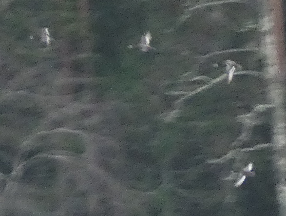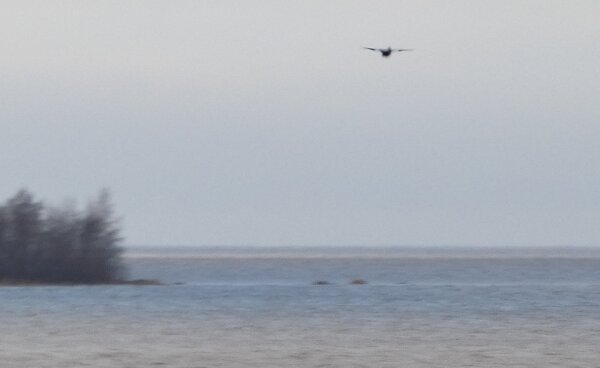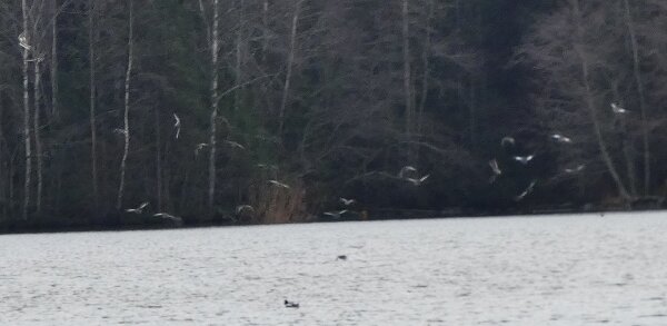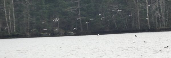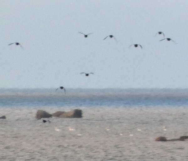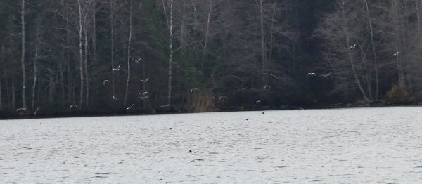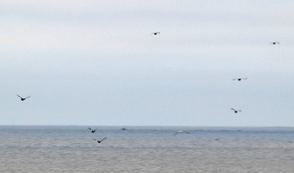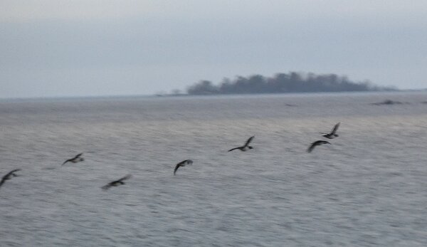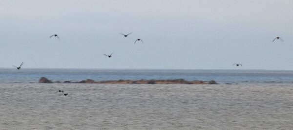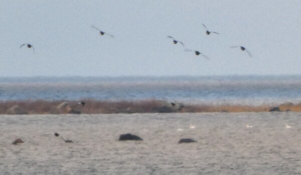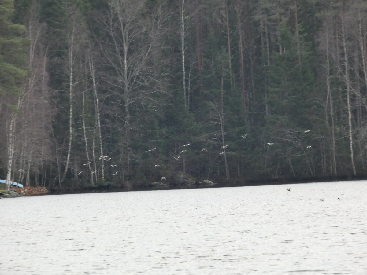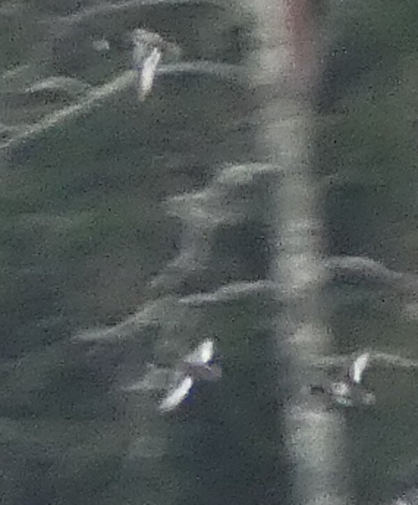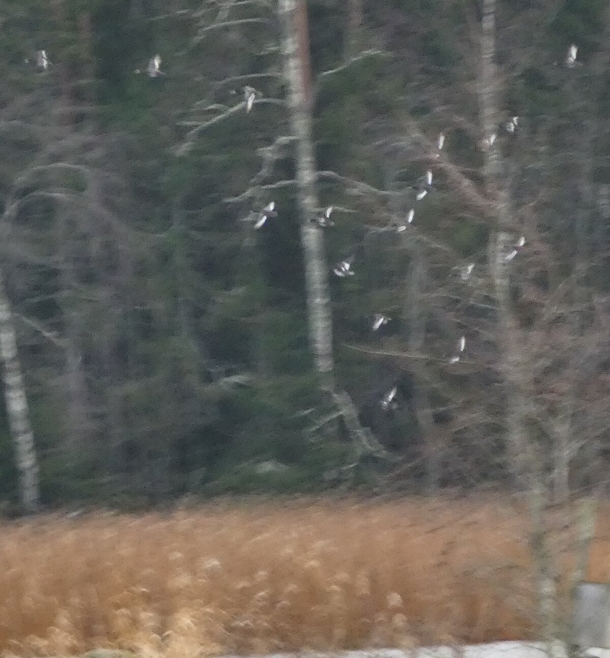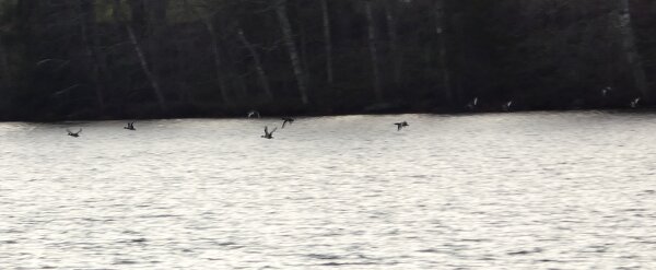 Kuvista huomasin, että tuossa tukkasotkalintuparvessa on sellaisia lintuja monta, joilla on harmaat siiven yläpinnat suurelta osaltaan. Yhdellä, jolla näkyy myöskin paljon valkoista nokan tyvellä, on erikoisesti kyynärsulkien valkoisessa keskellä kuin ruskea raita. Parvessa on myöskin tavanomaisempia ruskeasiipisiä lintuja. Ovatko siis nuo harmaasiipiset ehkäpä niitä, jotka kuin muistuttavat jossain määrin pikkulapasotkia? Esimerkiksi sellaisia on, joilla ei ole töyhtöä, vaan niillä on sileä pään takaosa? Niitä näkee syksyisin. Sitten on se laji, joka jossain määrin on hieman lapasotkamainen tukkasotka. Sillä on paljon valkeata nokan tyvellä ja sileä pään takaosa. Se on vähän kuin pieni lapasotka. Jos tällaisilla olisi selässään harmaita höyheniä, niin voisi alkaa jo miettiä, että ovatko ne pikkulapasotkia. Mutta kun niillä ei ole. Ne ovat myöskin tukkasotkien kokoisia ja kaltaisia suurelta osaltaan. Näyttäisi, että nimenomaan siiven yläpinnan pienet peitinhöyhenet ovat niillä harmaat.![]()