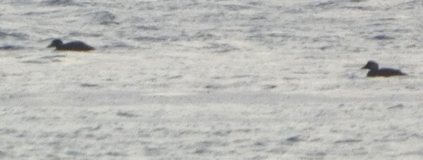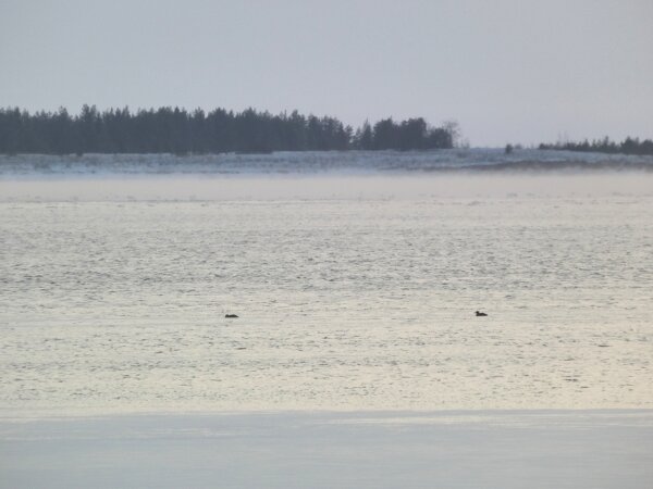 Kävin bongaamassa valkoposkivesilinnun, kuten sitä nimitän. Ilmeinen pari - selvästikin, nuoripari. Laji näyttää nopeasti katsoen sulkeltavan hyppäämällä siivet supussa, mutta voi havaita, että siivet levitetään vasta kun ne ottavat veteen. Siis ihan hypyn lopuksi. Naaras on pyöreäpäisempi, hieman pienempi ja koiras neliskanttisempi ja selvästi isompi kokoinen. Saukkoa ne näyttivät väistävän, jossain määrin. Saukko sai siitä niiden aika läheltä kalan. Saaren kärjessä oli ihan rannan tuntumassa norppa. Myös sitä on tuollaisten lintujen hyvä väistää? Vaikka taitaa enempi maistua sillekkin kala. Vesilinnuissa on ikävästi höyheniä, jotka tarttuvat suuhun joka paikkaan, jos niitä yrittää ahmia. Oli mukava talvinen retki. Oli talviset olosuhteet, vaikka saaren ympärillä olikin paljon sulaa. Valkoposkivesilintuparia ei käsittääkseni voinut nähdä ainakaan tänään, jos ei mennyt vähän lähemmäksi ja katsonut korkeammalta. Ainakaan minä en nähnyt niitä tähystellessäni sataman sillalta. Piti mennä aina sinne etelänpuolen ison valkoisen kiven luokse, että ne näki.![]()