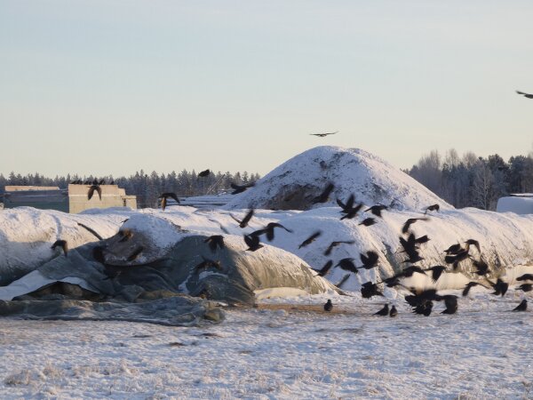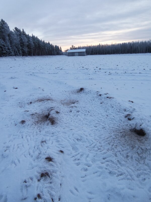 Närhien jälkiä. Ne ovat kaivaneet viljan jyviä, joita siinä on. Siitä nuo jäljet. Siinä on ollut kasa jyviä, mutta sitten pelto on kynnetty ja siksi jyvät pitää kaivaa pintamaan alta. Tässä tapauksessa.